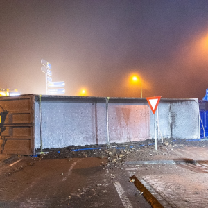 Vrachtwagen kantelt op rotonde, chauffeur gewond