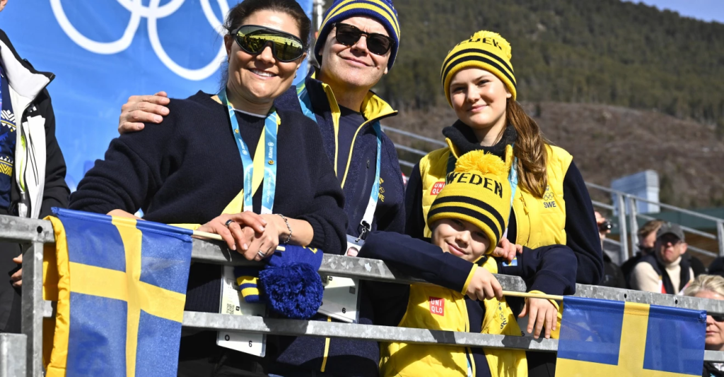 Victoria och prins Daniel stod och njöt av såväl det fina vädret som den fina skidåkningen, från läktaren ihop med barnen prinsessan Estelle och prins Oscar.