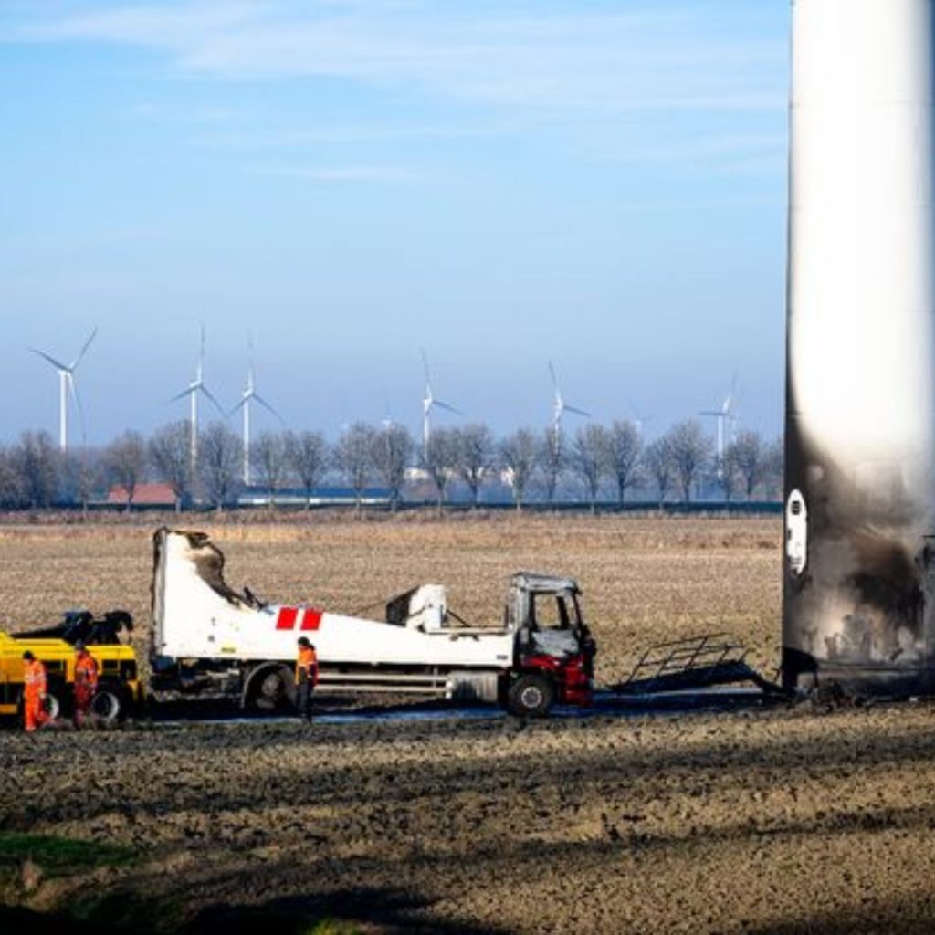 De lege vrachtwagen wordt daarna onderaan een windmolen neergezet en rond 05:55 uur in brand gestoken. Met het vuur hopen de boeven vermoedelijk sporen uit te wissen. De vlammen zorgen ook voor schade aan de voet van de windmolen.