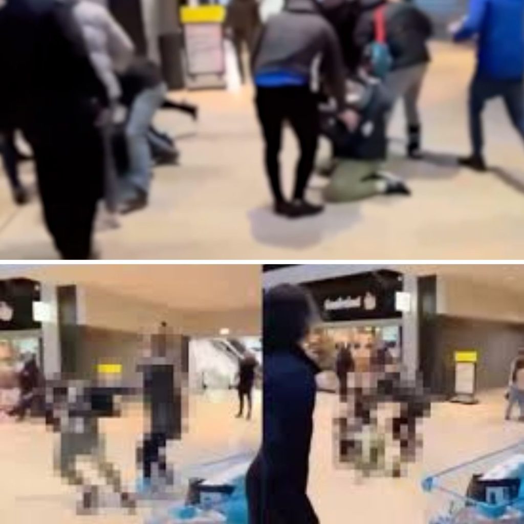 Verderop in het winkelcentrum wordt opnieuw met de hakbijl gezwaaid. Zowel de man met het wapen als een andere betrokkene belanden op de grond.