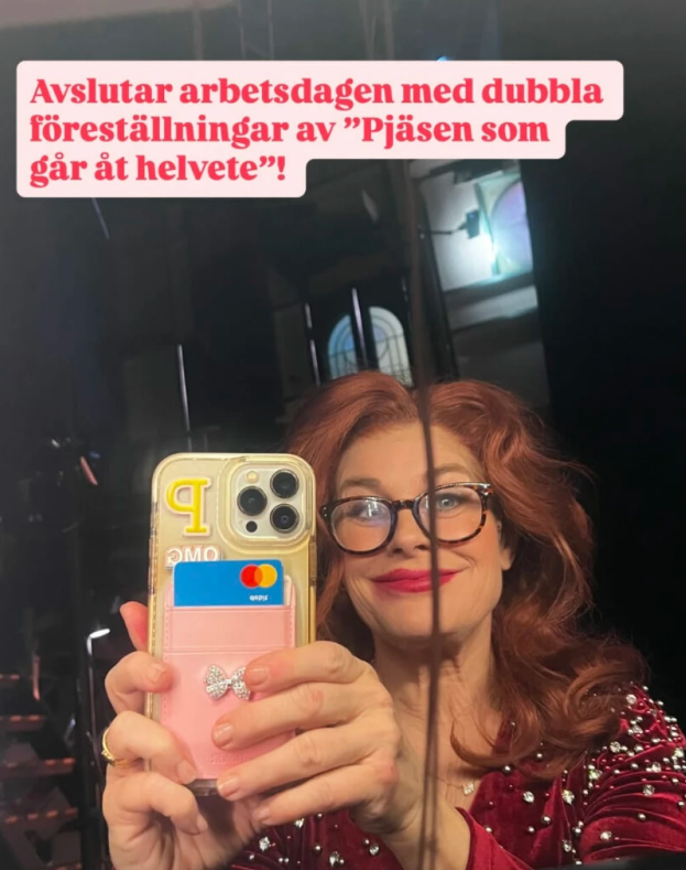 “Avslutar arbetsdagen med dubbla föreställningar av “Pjäsen som går åt helvete”! skriver hon.