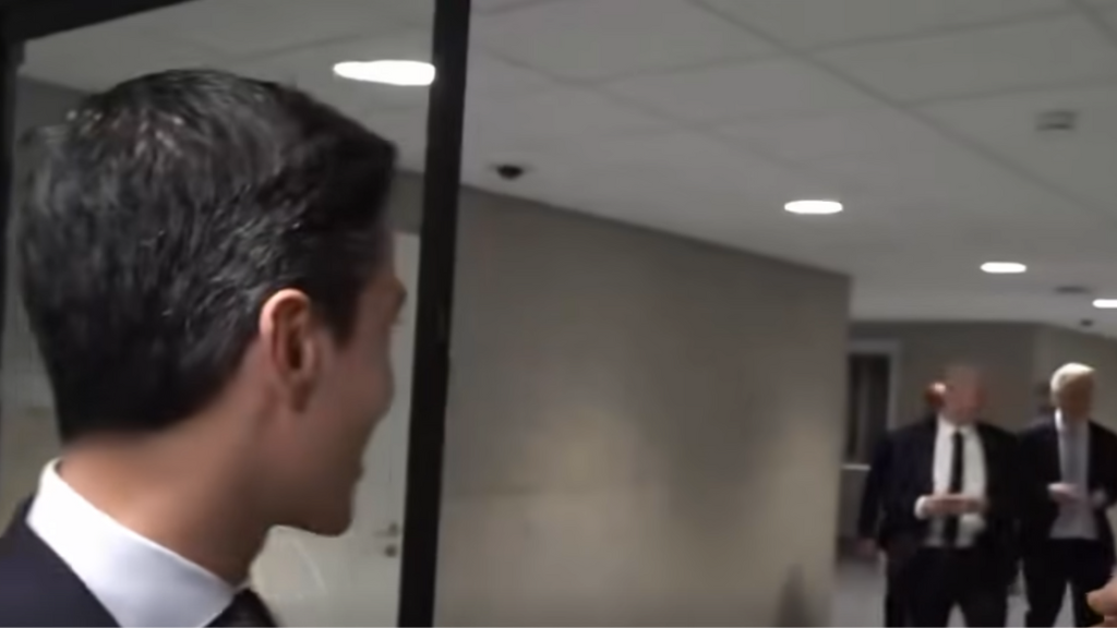 Rob Jetten staat daar een interview te geven aan de pers, terwijl hij spreekt over gesprekken die die dag en de dag erna gevoerd zullen worden. De sfeer lijkt rustig, tot Geert Wilders vanuit de gang komt aanlopen.