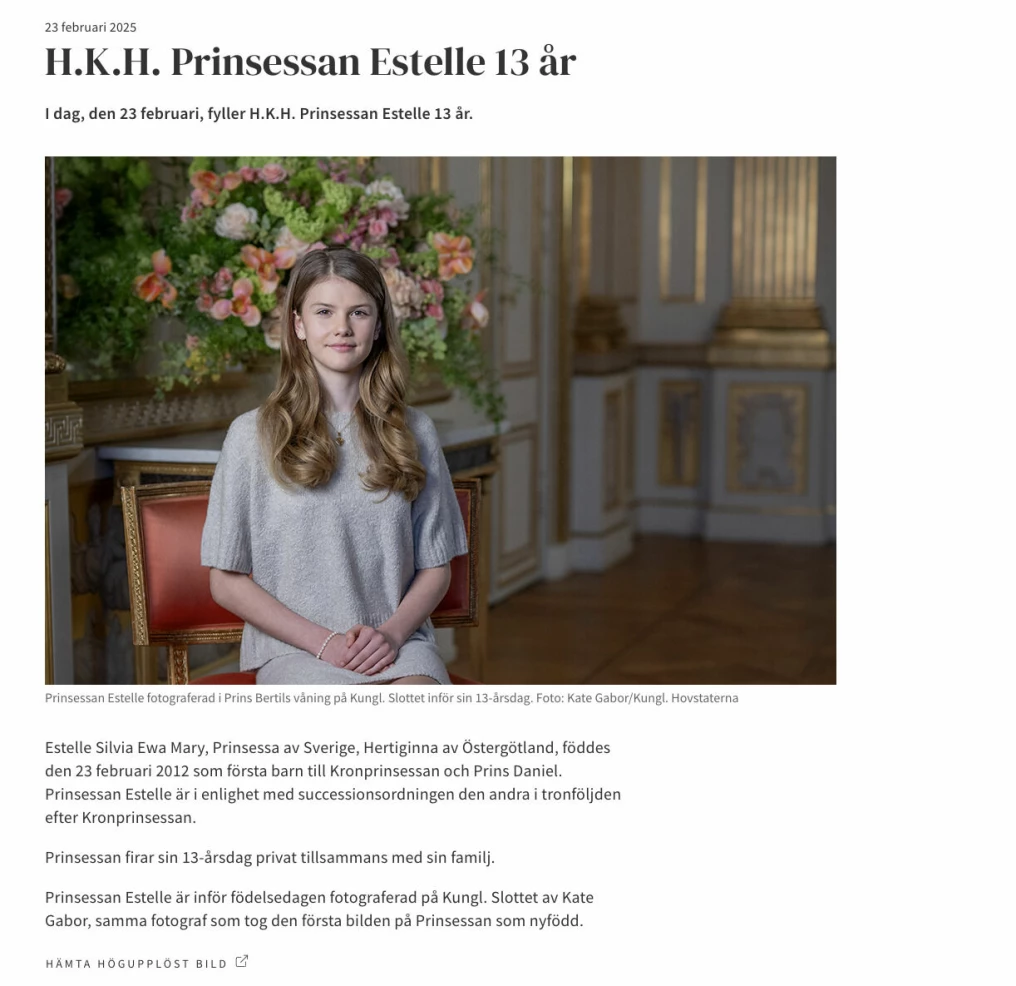 När Estelle fyller år ser det ut så här på hovets hemsida, med en ny bild och information om födelsedagsbarnet: